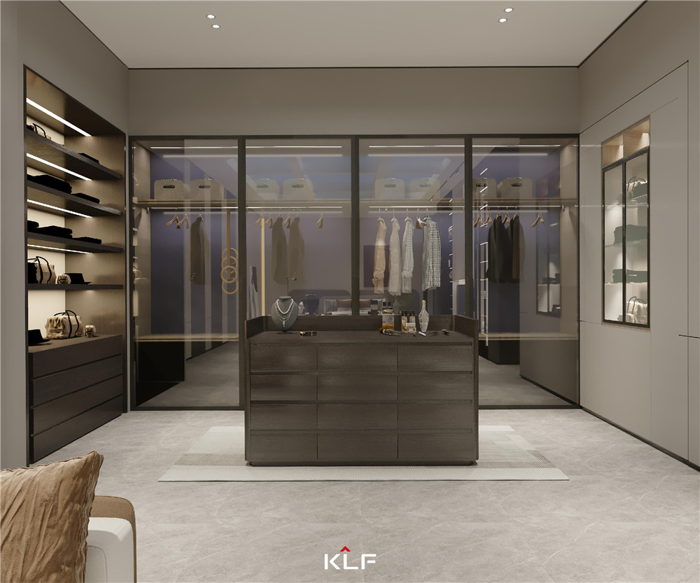 衣帽间采用时尚科技的电动平移巴士门,于细节之处彰显魅力;将衣柜分为叠放区、悬挂区和抽拉区,分功能存储提高生活便捷度;衣帽间岛台中间可设计升降饰物架,存储高价值的饰品。